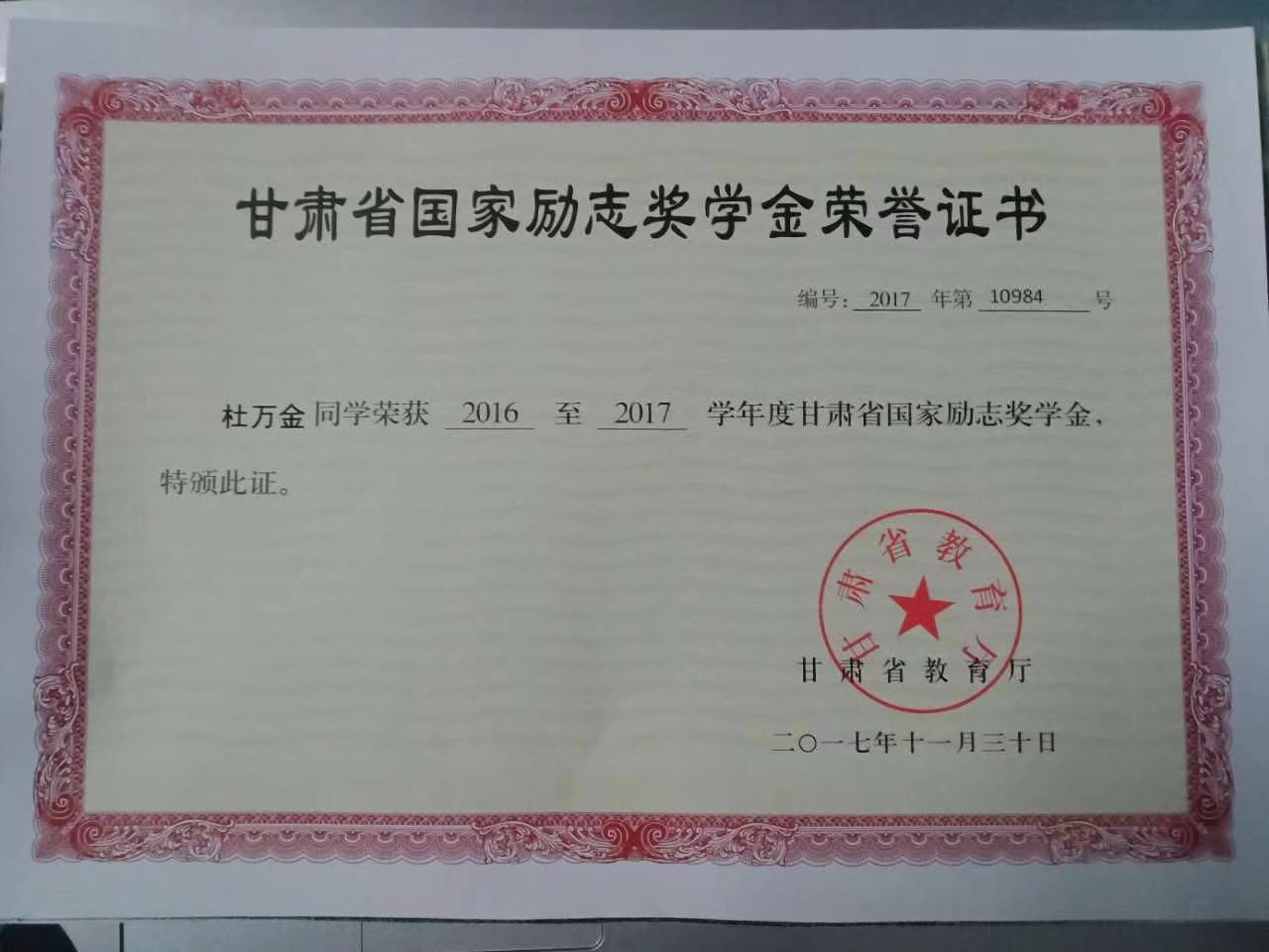8、2017年11月获得2016-2017学年度甘肃省国家励志奖学金;