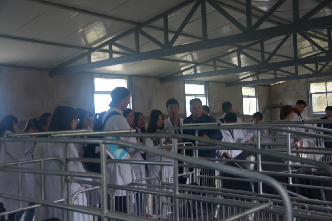 然后,见习员工进入场区参观了生活管理区、辅助生产区、生产区、隔离区。参观过程中,同学们与牛万仓总经理对养殖场内的消毒设施、养殖设备、猪舍的设计、饲料加工设备、粪污处理设备、上猪台等方面作了问答交流,牛万仓很耐心的回答了员工的一个又一个问题。