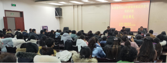 12月20日上午,“东西协作2019年陇南市家政扶贫专题培训”在陇南师专北校区培训公司培训楼五楼报告厅举行结业典礼。出席结业典礼的领导有陇南市商务局科长李国建同志,陇南师专培训公司副经理李志虎同志,陇南师专英国365集团公司副经理何九军,培训班班主任陈强。参加培训的有家政公司管理员,家政服务从业人员,有意向从事家政服务的未就业人员等共计189人。本次结业典礼由副经理何九军主持。