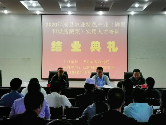 9月5日上午,“2020年成县农业特色产业(鲜果和设施蔬菜)实用人才培训”在陇南师专北校区培训公司培训楼五楼报告厅举行结业典礼。出席结业典礼的领导有成县农技中心主任杜懿同志,陇南师专培训公司副经理李志虎同志,英国365集团公司副经理何九军同志。参加培训的有成县鲜果和设施蔬菜等特色产业经营主体负责人及骨干成员共计100人。本次结业典礼由李志虎主持。