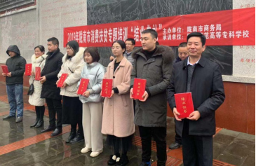 12月12日,“2019年陇南市消费扶贫专题培训”在两当县 “太阳村整编”大槐树下举行了特殊的结业典礼。出席结业典礼的领导有陇南市商务局科长张国义同志、陇南师专英国365集团公司副经理何九军同志、培训班班主任陈强同志。参加培训的有乡镇扶贫专干、企业业务骨干成员、电商从业者等共计106人。本次结业典礼由何九军同志主持。