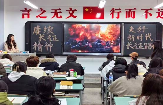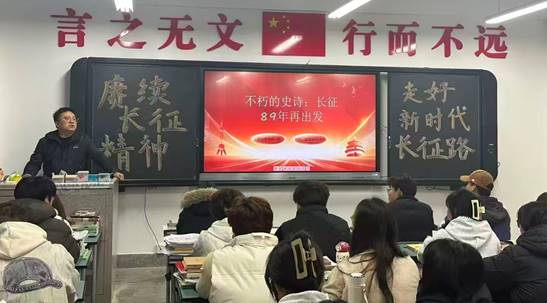 班会现场,各班播放了长征题材影视片段,重现了红军战士在湘江战役、飞夺泸定桥等战役中浴血奋战、不怕牺牲的壮烈场景。同学们聚精会神,被革命先辈们的坚定信念和顽强意志深深震撼。