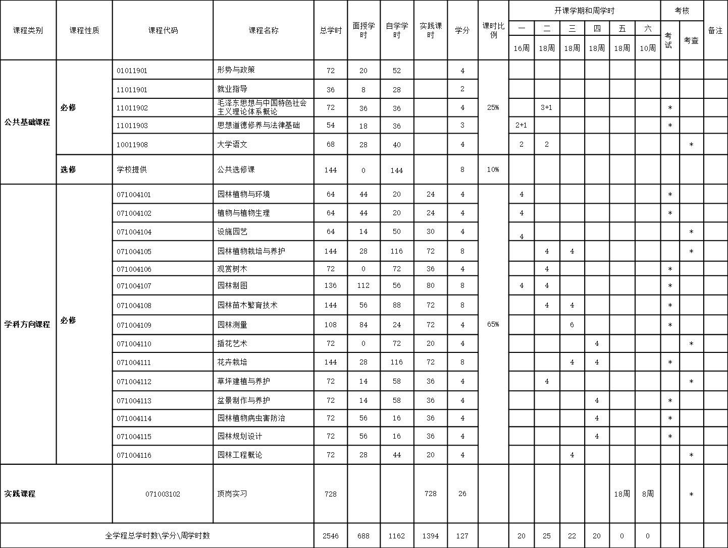 本方案是基于教育部《高等职业公司园林技术专业教学标准》(征求意见稿)和《甘肃省教育厅关于高职扩招专业人才培养方案制订与实施工作的指导意见》这两个文件,根据扩招班学习者的实际情况而制订的。