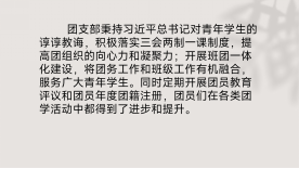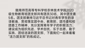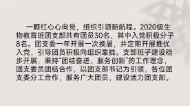 2020级生物教育班团支部秉持习近平总书记对青年员工的谆谆教诲,积极落实三会两制一课制度,提高团组织的向心力和凝聚力;开展班团一体化建设,将团务工作和班级工作有机融合,服务广大青年员工。