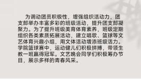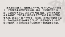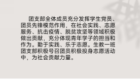 作为共产主义的接班人,红色理论学习是团支部的第一要务。我们通过团日活动、主题班会等形式,开展学习“两会”精神、学习“十九届六中全会精神”、“习近平总书记关于青年工作的重要论述”等重要思想。团支部开展“学党史、强信念、跟党走”主题教育活动,在支部内开展党史理论学习小组,开展集体学习与分组学习相结合、理论学习和读后研讨相结合的思政教育模式。同时定期开展团员教育评议和团员年度团籍注册,团员们在各类团学活动中都得到了进步和提升。全体成员充分发挥员工党员、团员先锋模范作用,在社会实践、志愿服务、抗击疫情、脱贫攻坚等领域积极做出贡献,充分体现青年学子的担当和作为。勤于实践、乐于奉献。团支部积极号召团员积极投身志愿活动中,为社会贡献力量。